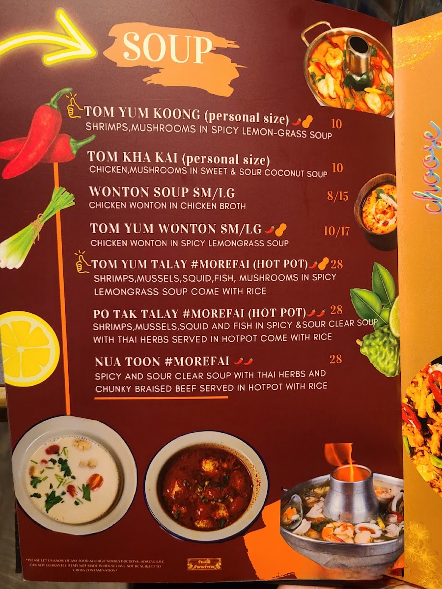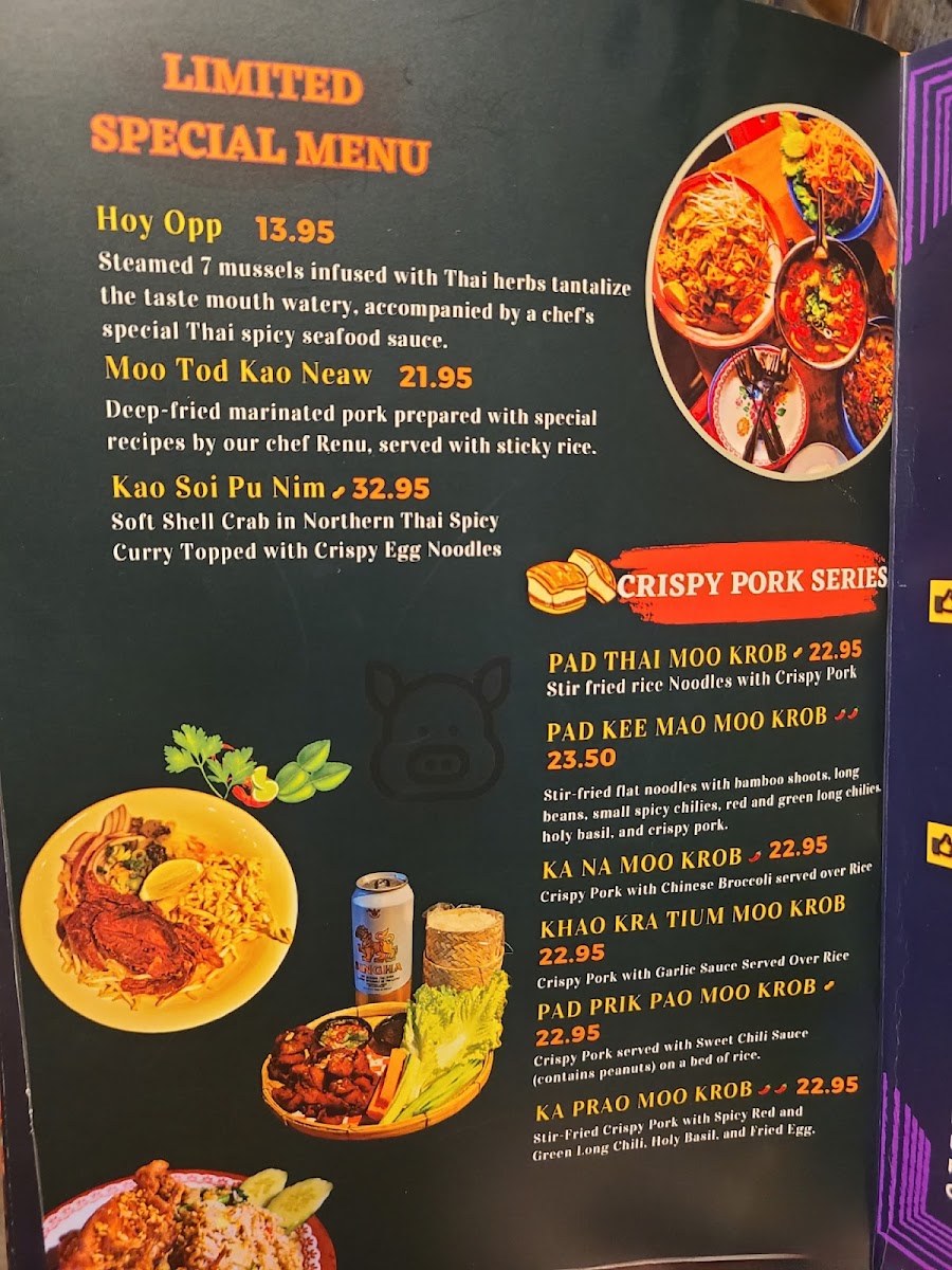 Appetizers: Dive into tantalizing options such as Tom Yum Wonton Soup and Soft Shell Crab Khao Soi.